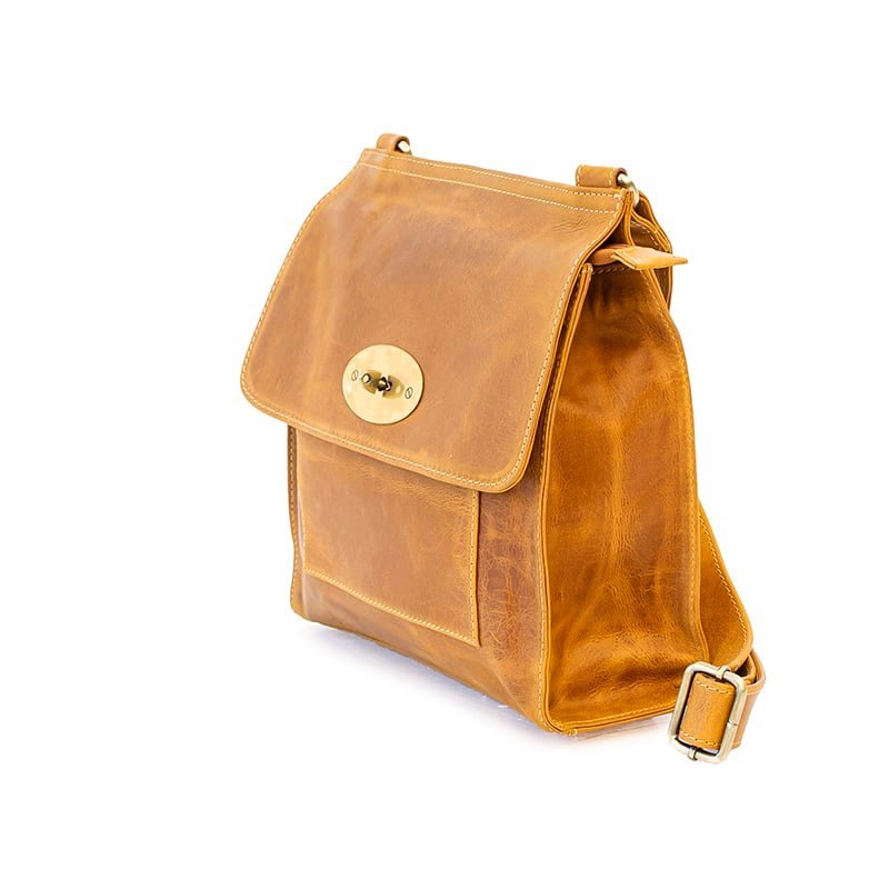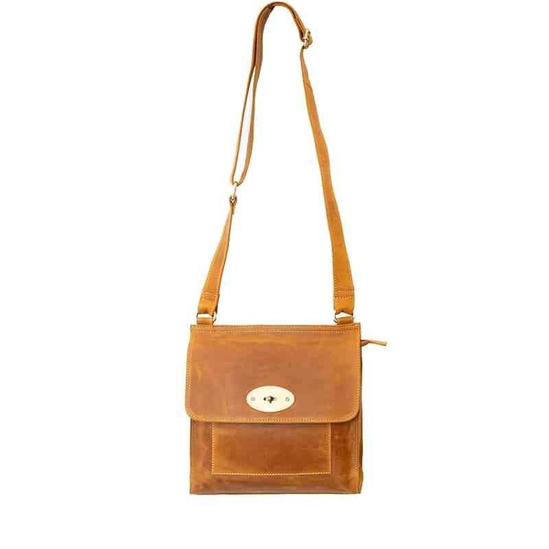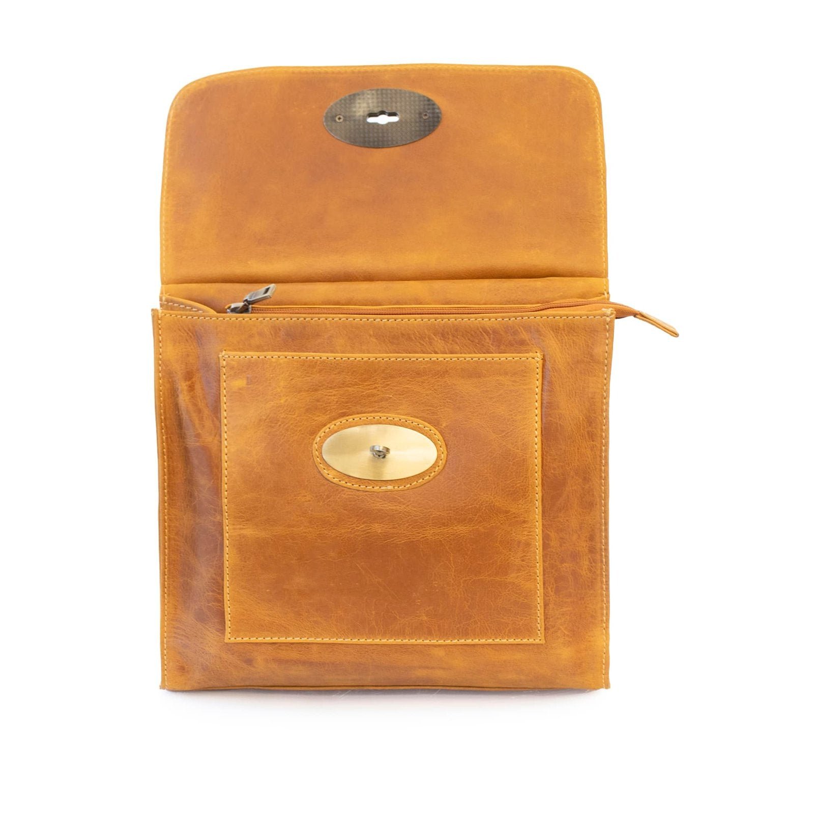 It’s made from genuine leather with brass fittings, so it looks smart without being overdone. The twist-lock closure on the front keeps things secure and adds a nice touch, and there’s a slip pocket on the outside for your phone or keys so you’re not unzipping every time you need them.