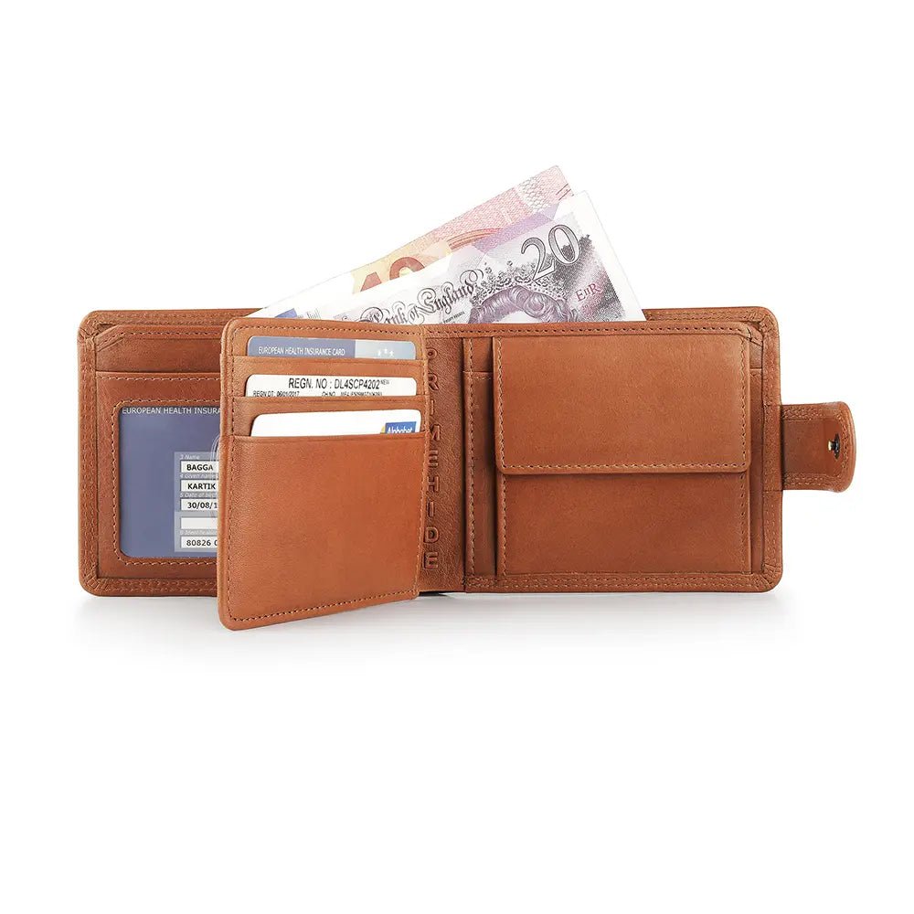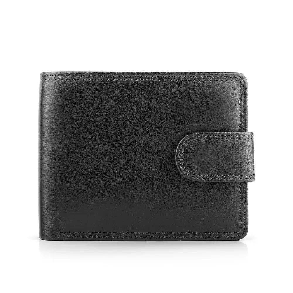 The James Leon genuine leather wallet for men combines premium craftsmanship and practical design. Made from real leather, it features a secure tab closure and RFID protection to safeguard your cards and personal information. With 6 card slots, 2 slip pockets, an ID window, a buttoned coin pocket, and a twin note section, it offers ample storage for all your essentials. The elegant herringbone lining adds a touch of sophistication, and it comes beautifully packaged in a gift box, making it an ideal gift for any occasion.