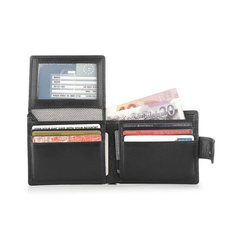 The Julian Leon leather trifold wallet for men is crafted from genuine leather with a classic tab closure and RFID security for added protection. Featuring 9 card slots, 2 slip pockets, a flip-up ID window, a twin note section, and herringbone lining, it’s the perfect blend of style and functionality, beautifully presented in a gift box.