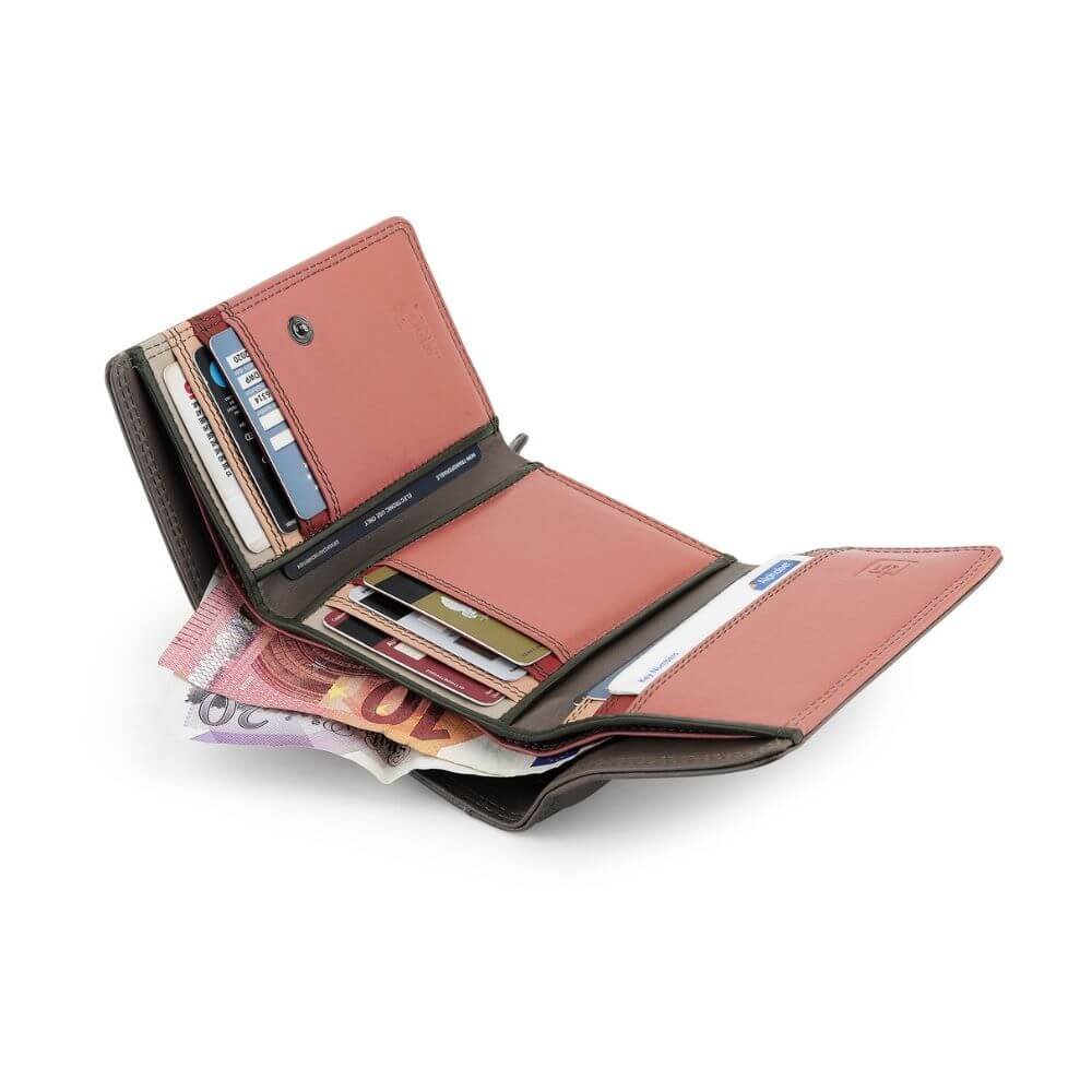 A secure button closure keeps everything neatly enclosed, while the built-in RFID protection helps prevent digital theft. Inside, you’ll find 8 card slots, handy slip pockets, a full note section, and a back zipped pocket for coins or small essentials.