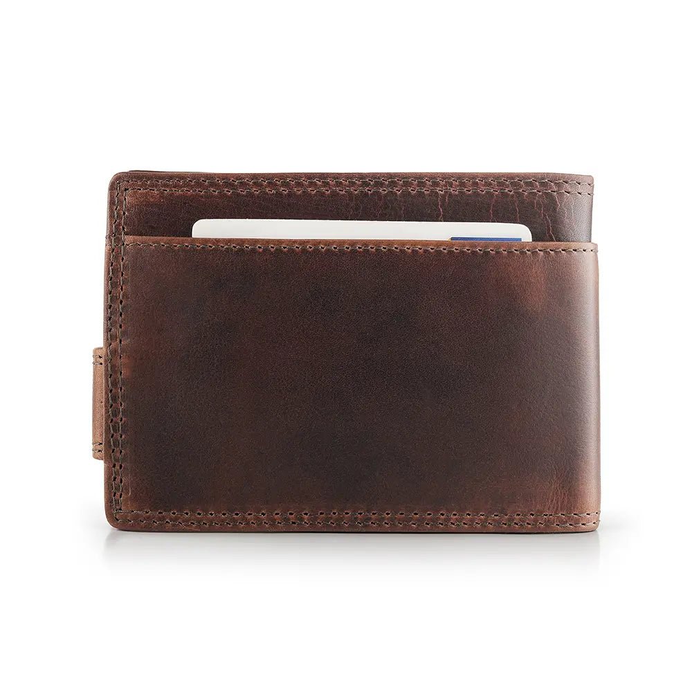 Designed with security in mind, the integrated RFID-blocking technology protects your cards from digital theft, giving you peace of mind on the go. The classic bifold design features a secure tab closure, ensuring your essentials stay organised and protected.
