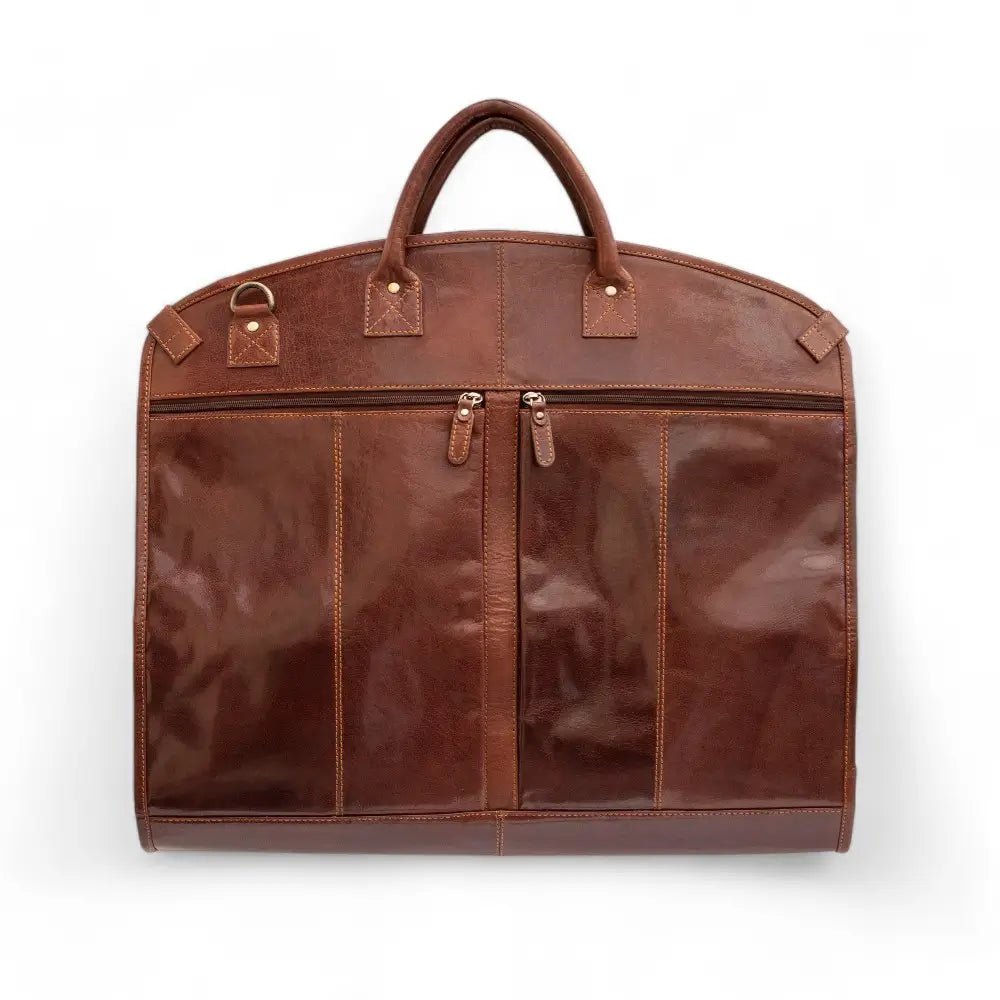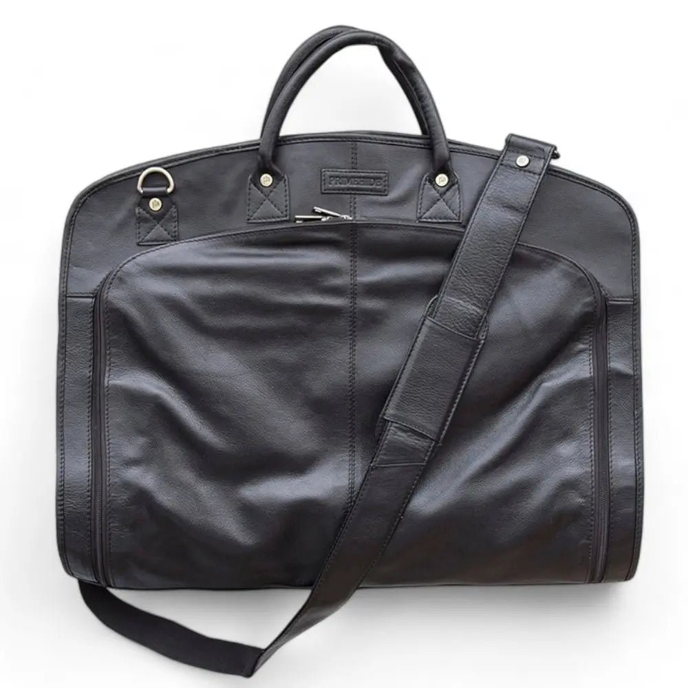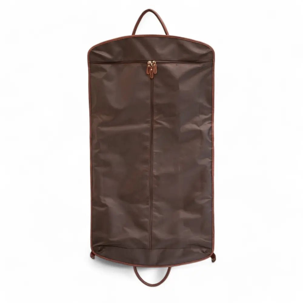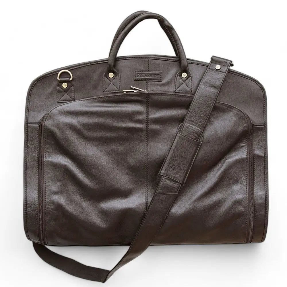 Travel in style with this premium leather garment carrier, designed to keep your suits perfectly protected on the go. It folds neatly in half and secures with poppers for easy carrying, whilst the interior features a top hanger loop and zipped fabric compartment to keep everything organised.