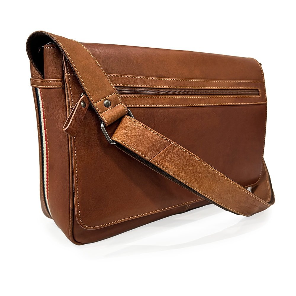 This stylish and perfect-sized Cognac Texan Messenger Bag is sure to become your go-to carryall for any occasion. Crafted in genuine leather, this high quality bag features a unique striped design in the classic colours of red, white and blue down the sides, making it a true statement piece.