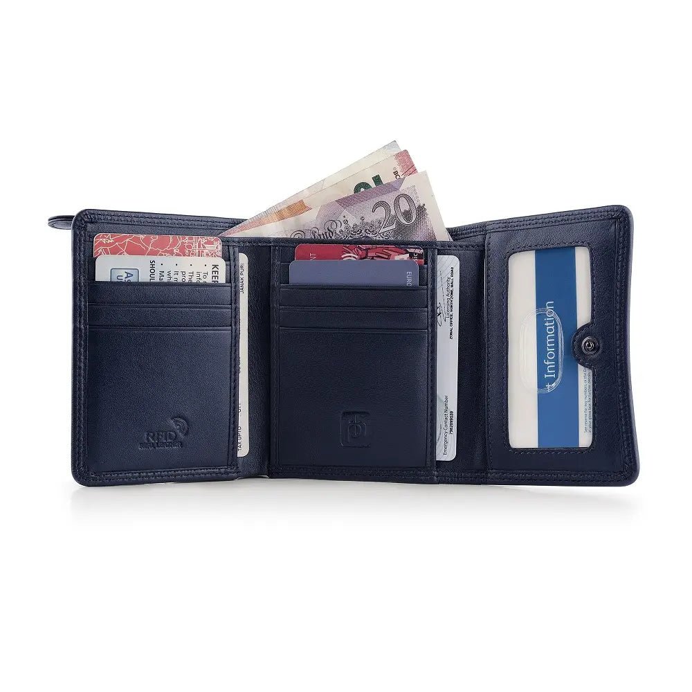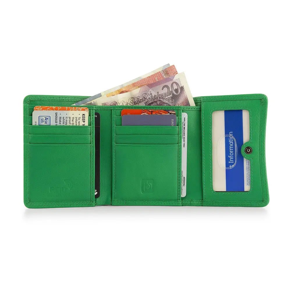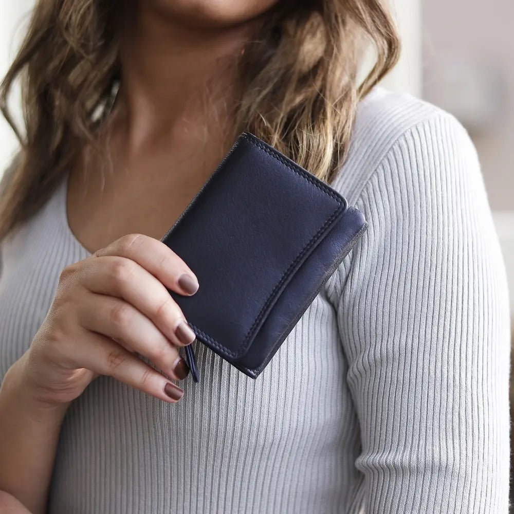 It’s made from soft leather that feels lovely, and it’s got RFID protection built in so your contactless cards are safe. There are eight card slots, a window for your ID, a section for notes, and a zipped coin pocket so your change isn’t rattling around loose. The popper fastening keeps everything secure but doesn’t slow you down when you’re trying to pay for something quickly.