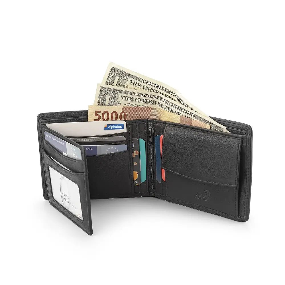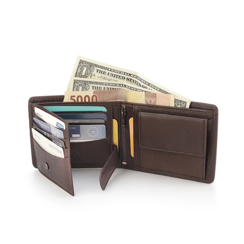 Open it up and you’ll find nine card slots, so there’s plenty of space for all your cards without having to shuffle things about. The ID window lets you flash your photo ID quickly, whilst the buttoned coin pocket keeps your change secure and out of the way. There’s a small zipped pocket inside for anything you want extra safe, and twin note sections to keep your cash organised however you like.